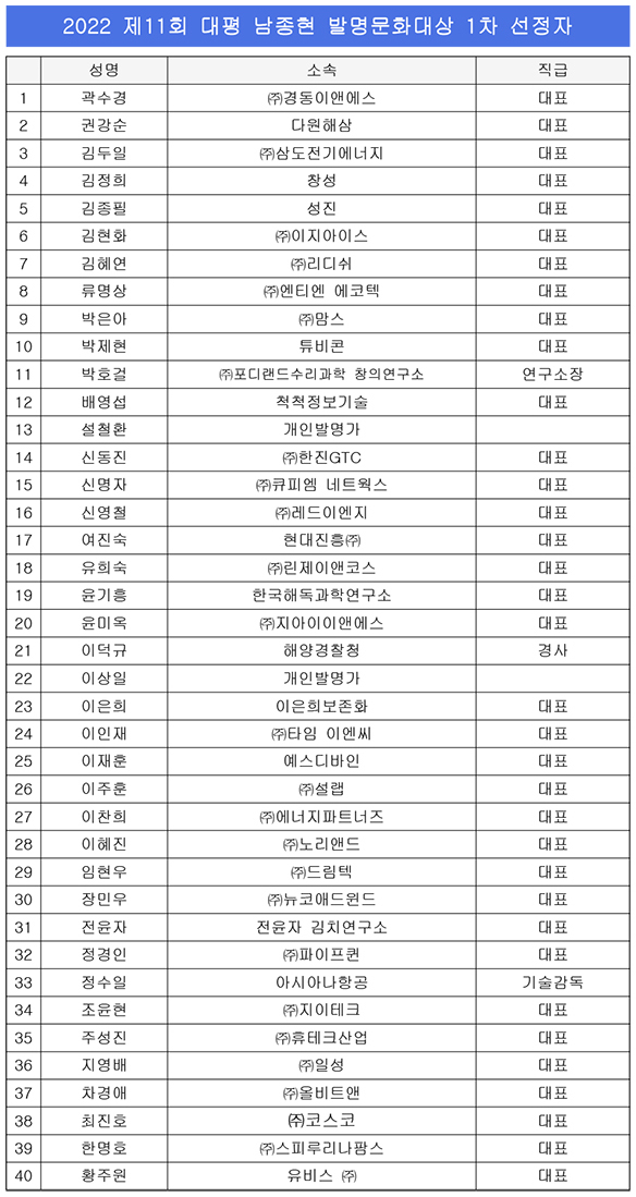 2022 제11회 대평 남종현 발명문화대상 1차 선정자 발표