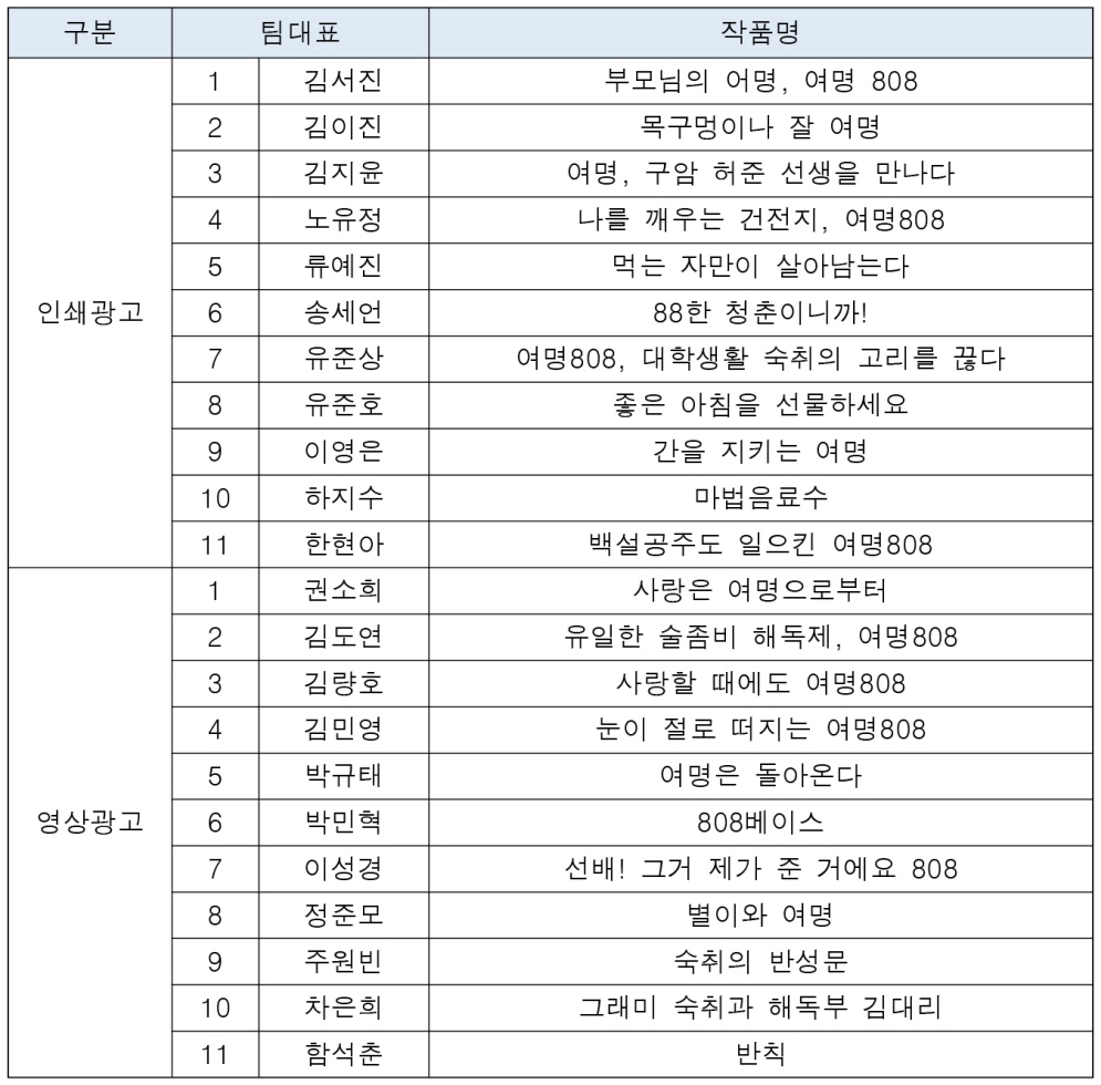 제3회 여명808 대학생 광고공모전에 참여해주신 응모자분들께 진심으로 감사드리며 상기와 같이 1차 선정팀을 발표합니다.